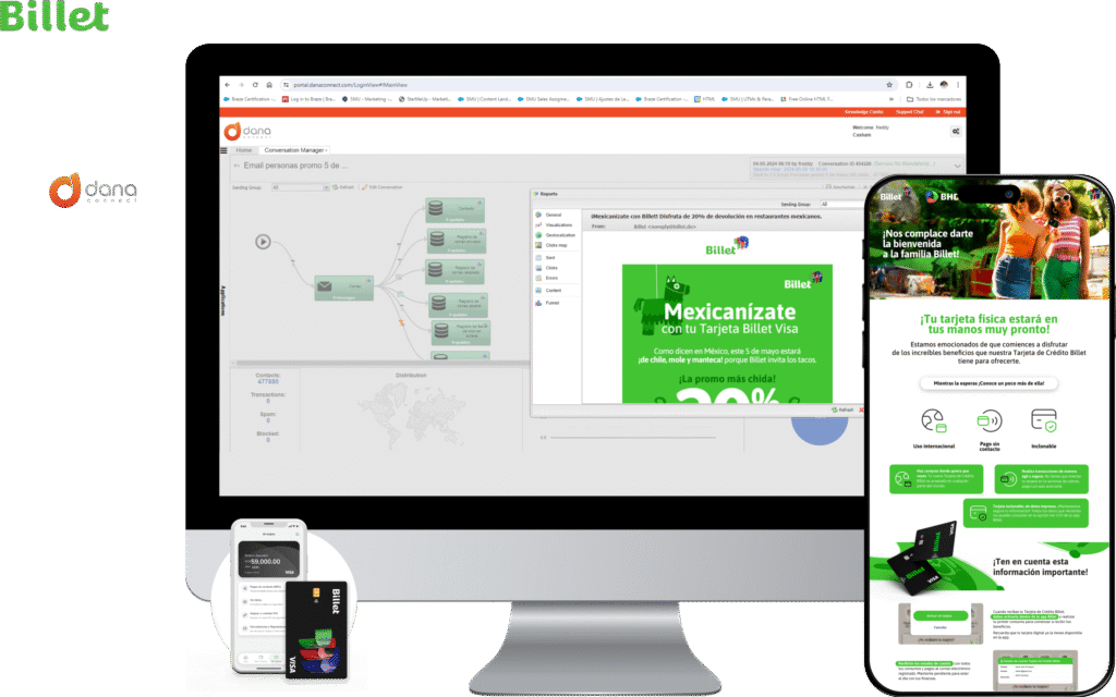 Billet is a BHD Financial Center company that offers an electronic payment account accessible from a cell phone. With Billet, it is possible to pay for services, make delivery purchases, use transportation, receive remittances, transfer money in real time and recharge minutes. As administrator of DANAConnect, my responsibilities included managing databases of businesses and individuals in the Dominican Republic, creating templates for email marketing, creating push notifications, in-app messages, SMS, and generating content for the aforementioned channels. In addition, I was in charge of generating metrics to analyze the performance of the different campaigns and creating automated flows to impact customers in the most appropriate channel and at the right time.