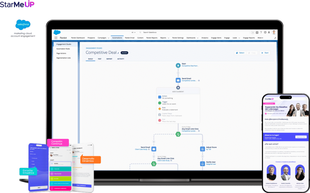 StarMeUp is a dynamic platform that enhances the employee experience, creating a more human culture that increases organizational commitment and performance. Creation of landing pages with forms for data and email capture with responsive design and development. Creation and manipulation of lead segments captured by the forms and sent to personalized, automated and multichannel journeys. Implementation of lead scoring to qualify potential customers according to their behaviors and information. Customer generation with the support of StarMeUp’s sales and services department (linkage with CRM). Connection with other third party applications (Paid Media) for webinars to facilitate segmentation and maintenance of campaigns. Lead enrichment through integration with ZoomInfo for a more accurate segmentation base.